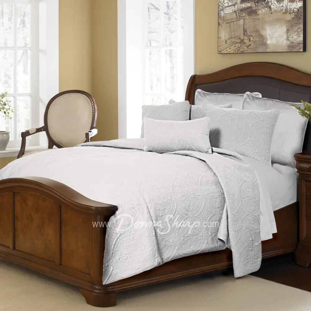 This elegant pure white whole cloth bedding ensemble is quilted with decorative medallion motifs. Poly batting helps the design to emboss, thus adding texture with a delightfully plush feel. All of our Ana patterns can be used as accent coverlets for your other bedding options. View the whole collection here.