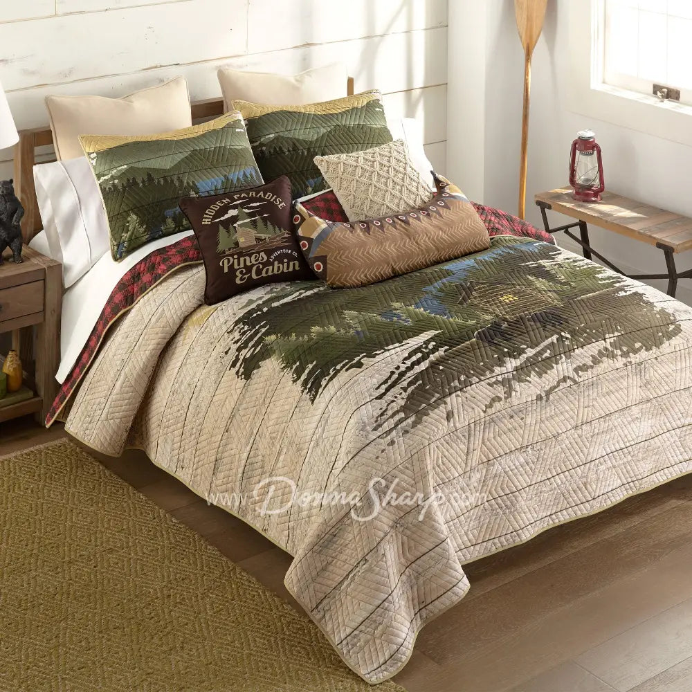 Donna Sharp Allegheny 3pc Quilt Set This rustic bedding ensemble features a peaceful mountain lake scene, two bears and a cabin. A soft sunset fades in the distance. Colors include ivory, country blue, pine and olive green, butter yellow, chestnut brown, cork brown and charcoal. The reverse features a red and dark brown buffalo check pattern. Easy care fabric. Set includes a quilt and 2 shams. Decor pillows sold separately.