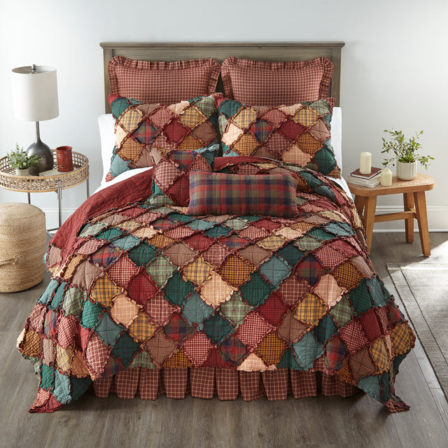Campfire is one of Donna Sharp’s originals and remains a best seller throughout the country. A traditional rag quilt, meaning small squares of woven-not printed-fabrics joined together with exposed seams that are clipped and frayed. This classic quilt is made from dozens of soft woven fabrics in rust, caramel, tan and hunter plaids that adds a wonderful texture to this cozy ensemble. The more this design is used and washed, the softer it becomes. All pieces sold separately.