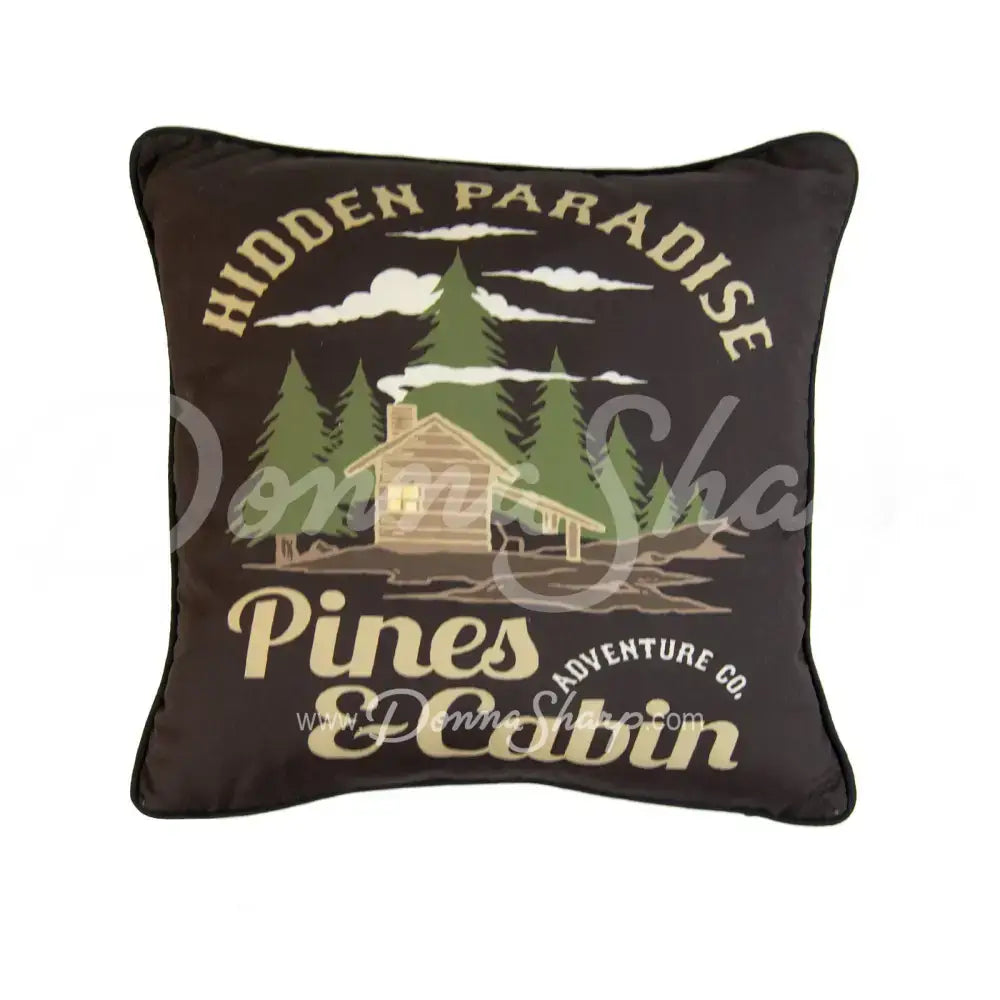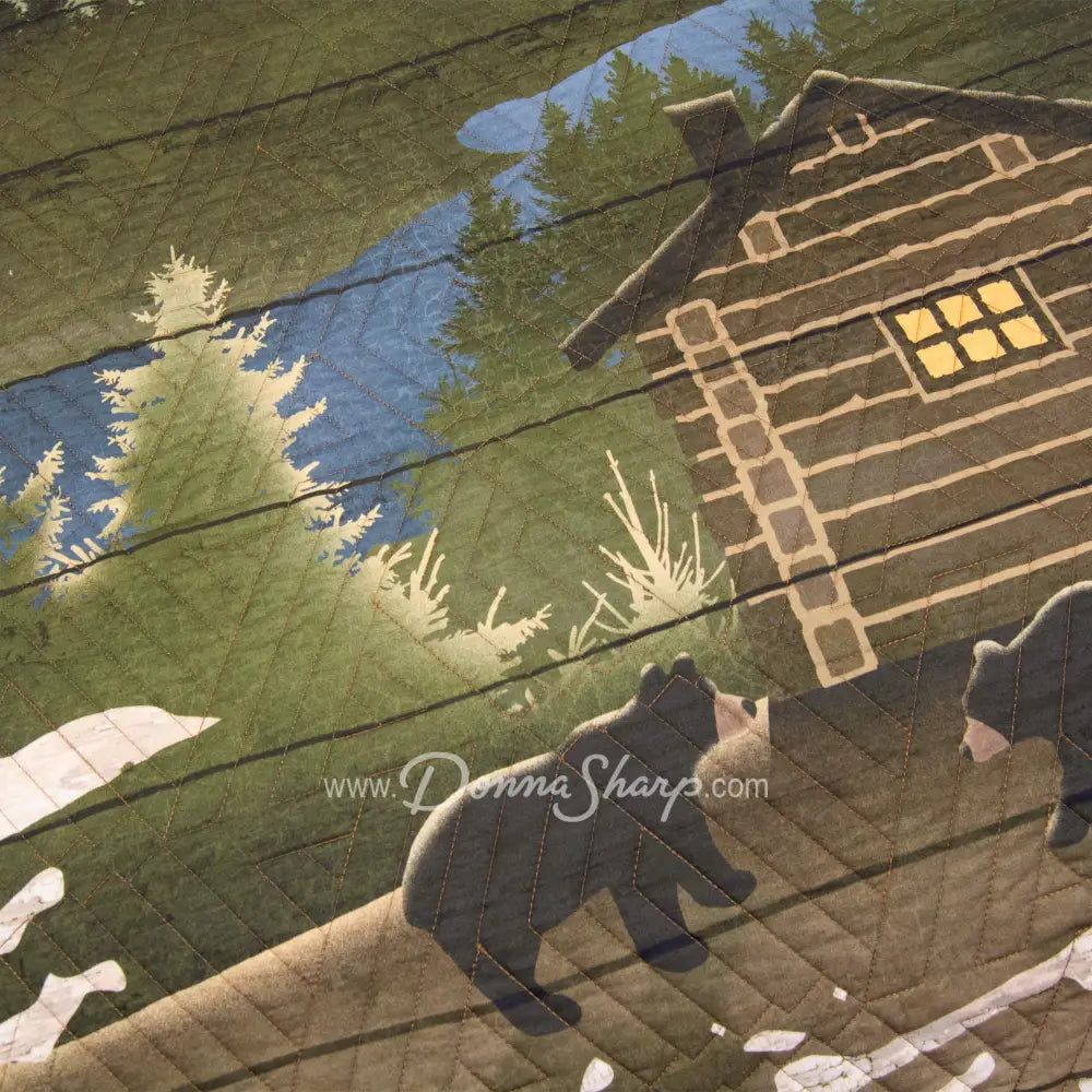 Donna Sharp Allegheny 3PC Quilt Set this rustic bedding ensemble features a peaceful mountain lake scene, two bears and a cabin. A soft sunset fades in the distance. Colors include ivory, country blue, pine and olive green, butter yellow, chestnut brown, cork brown and charcoal. The reverse features a red and dark brown buffalo check pattern. Easy care fabric. Set includes a quilt and 2 shams. Decor pillows sold separately.