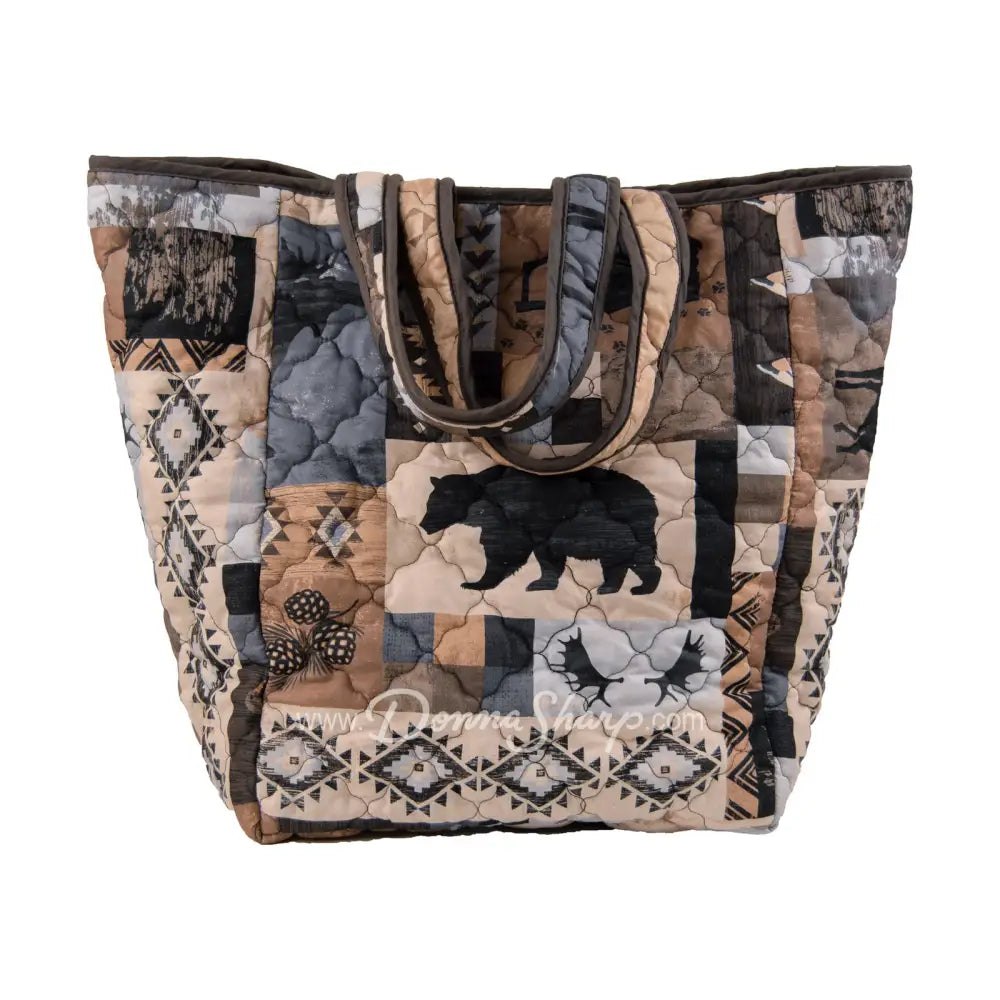 Kila lightweight quilt set from Your Lifestyle by Donna Sharp is a rustic bedding ensemble featuring a hopscotch geometric pattern with various forest-related elements arranged throughout. Deer, moose, bear, duck, log cabin and pine motifs are accented by geometric symbols. Colors include blue-grey, parchment, charcoal, chocolate, tobacco, sand and dusty blue. Set includes a quilt and 2 shams (Twin has 1 sham) Reversible for two bedding sets in one! Perfect for any bedroom in the home. Décor pillows and throw sold separately.