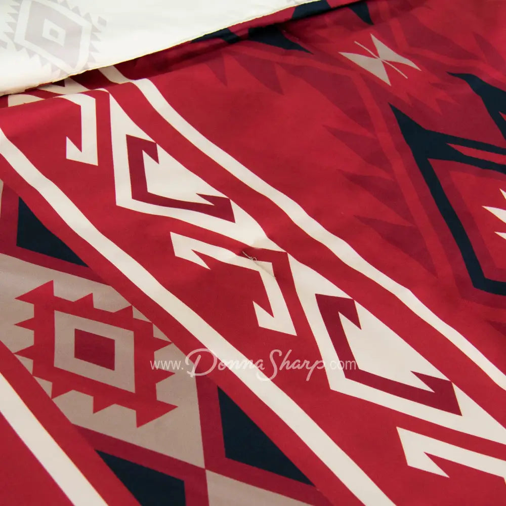 The Mesa 3pc comforter set is a striking bedding ensemble featuring a bold Southwest striped design, based on one of our best-selling patterns. Colors include deep red, terra cotta, charcoal and vanilla. The lining features a Southwest diamond pattern. The set includes a comforter and 2 pillowcases. Easy care machine washable fabric. Decorative pillows sold separately.