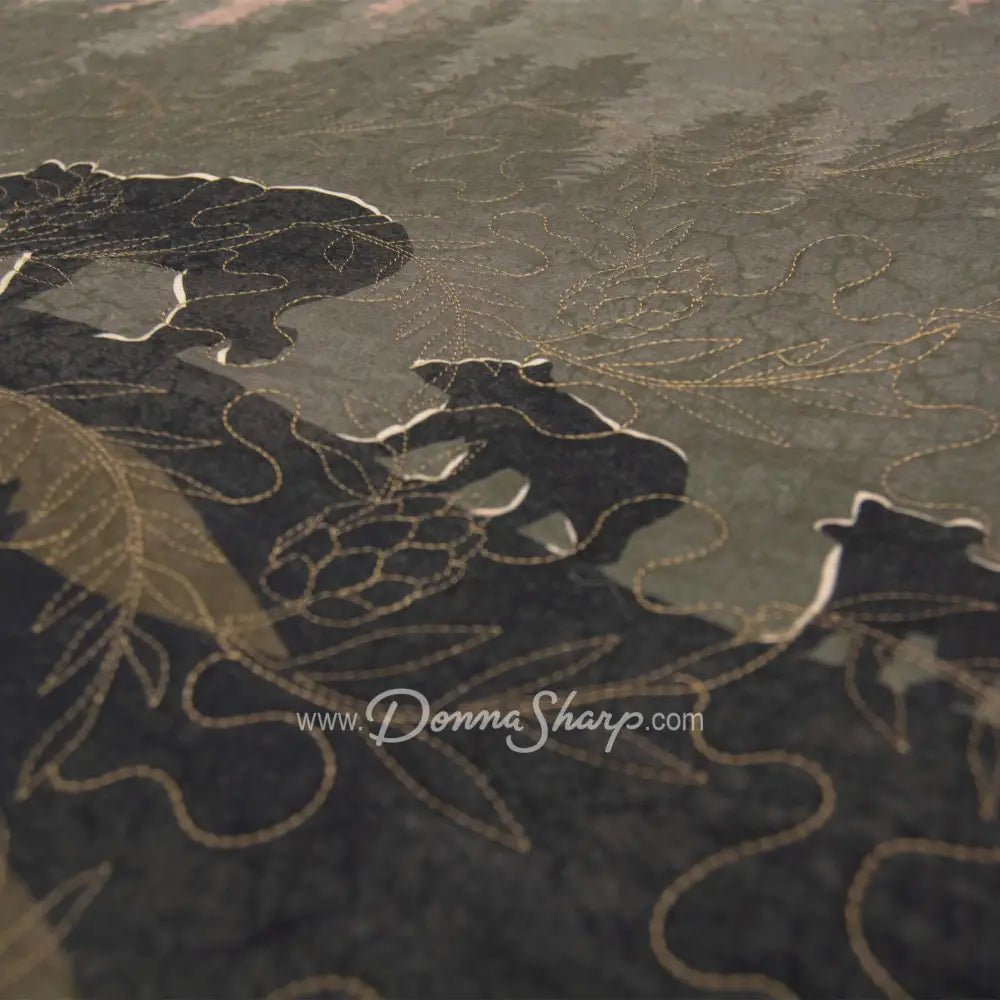 Mountain Moon 3pc quilted bedding set from Donna Sharp is a rustic bedding ensemble featuring a mountain scene with a mother bear and her two cubs. As they crest the hill, moonlight casts a shadow behind them. Colors include sand, fawn, shades of pine and olive green, dark brown, soft navy and charcoal. The set includes a quilt and two shams. Decor pillows sold separately.