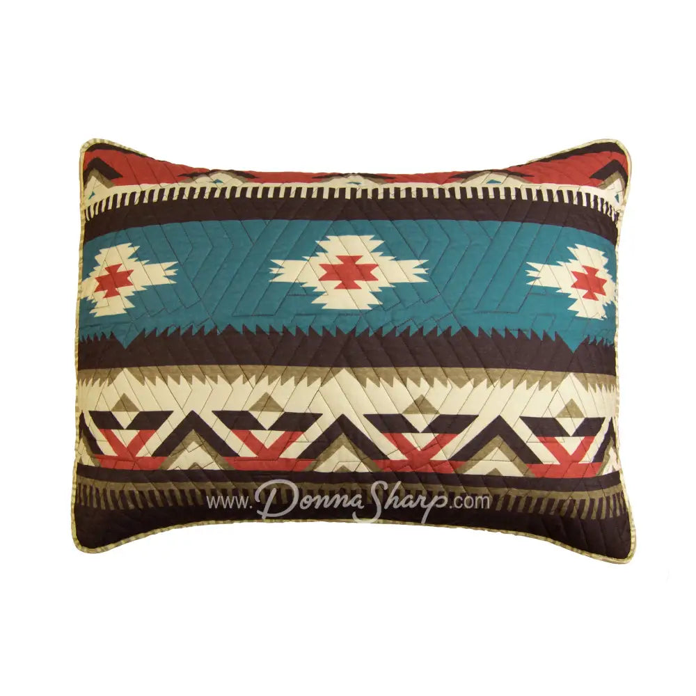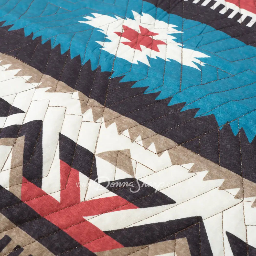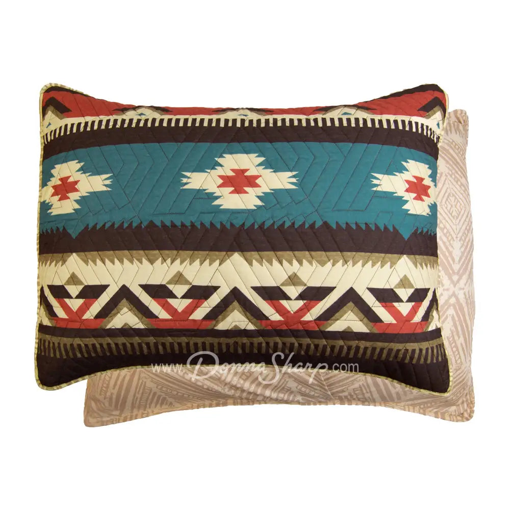 Mahogany Desert by Donna Sharp is a striking bedding ensemble featuring bold southwest motifs in shades of dark chocolate, deep teal, bronze, red clay and buttercream. The reverse features a sketched diamond pattern in golden tones. The set includes a quilt and 2 shams. Perfect for any bedroom in the house. Decor pillow covers sold separately. Soft, easy care machine washable fabric.