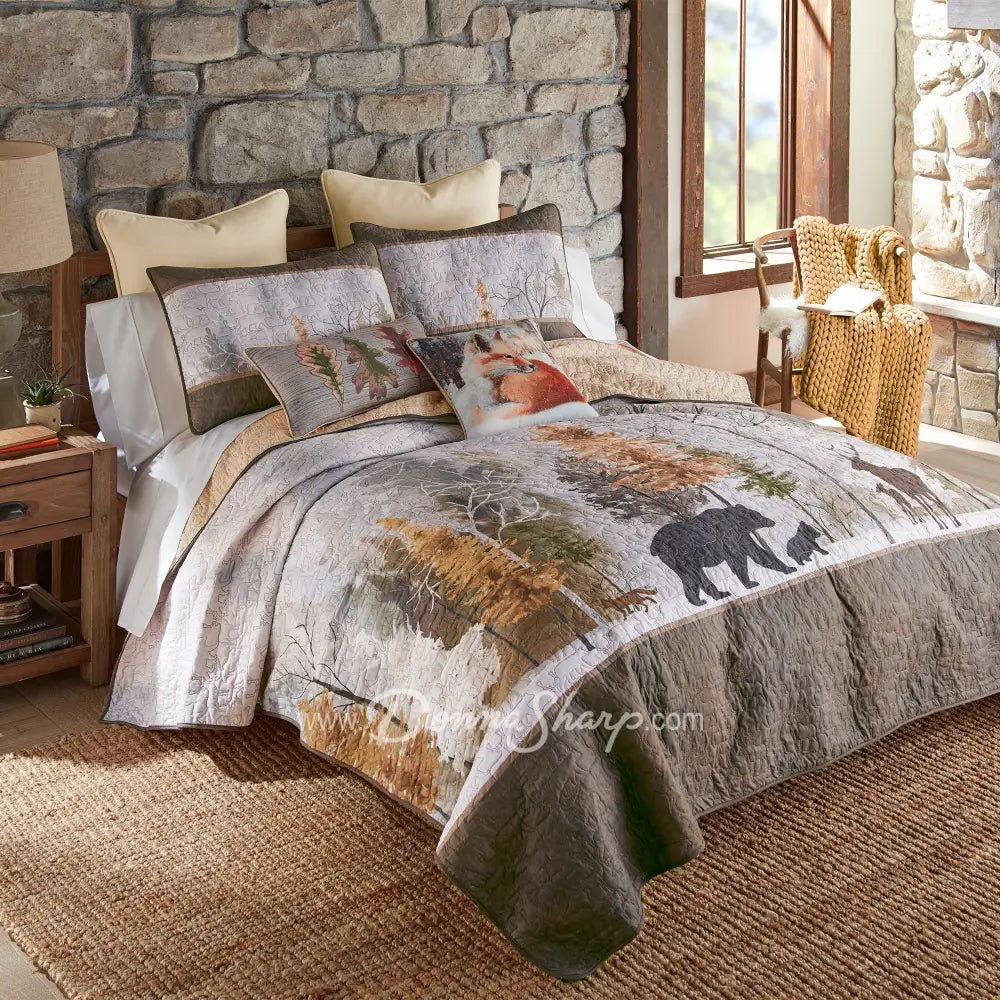 Dawn Mist 3pc Quilted Bedding Set from Donna Sharp This peaceful bedding ensemble features bear, deer, fox and birds surrounded by a watercolor forest. Colors include shades of olive green, cream, sage, chocolate, warm grey, sand, copper and charcoal. Set includes a quilt and 2 shams. Decor pillows sold separately. Easy care machine washable fabric. Eco-friendly packaging. Imported.