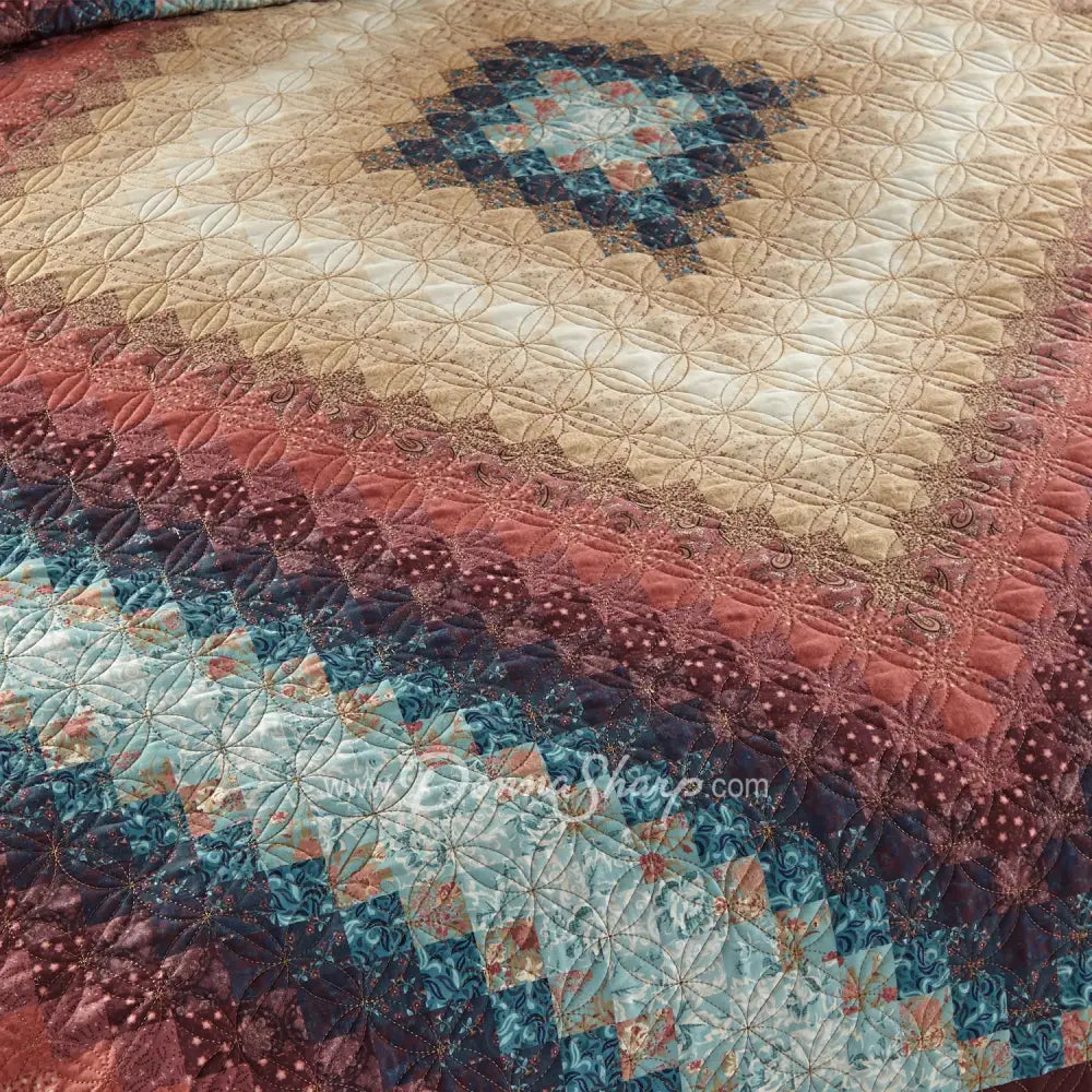 This eye-catching, quilted bedding ensemble from Donna Sharp, is based on a traditional "Trip Around the World" pattern. Colors include ivory, gold, spicy red, brick red, muted coral, baked clay, copper, seafoam and navy. Set included a quilt and 2 shams. Decor pillows sold separately. Easy care machine washable fabric.
