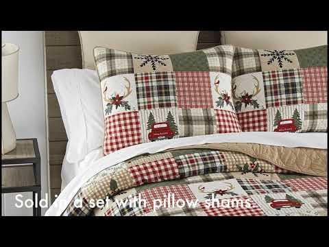 Introducing the Holly Forest 3pc Cotton Pieced Quilt Set by Your Lifestyle, where rustic charm meets festive elegance. Crafted from premium cotton, this bedding ensemble is a masterpiece of patchwork featuring a delightful array of plaid and gingham prints. Adorned with iconic winter motifs including snowflakes, red trucks, Christmas trees, black bears, deer, holly, and berries, each piece tells a story of cozy holidays and woodland adventures.